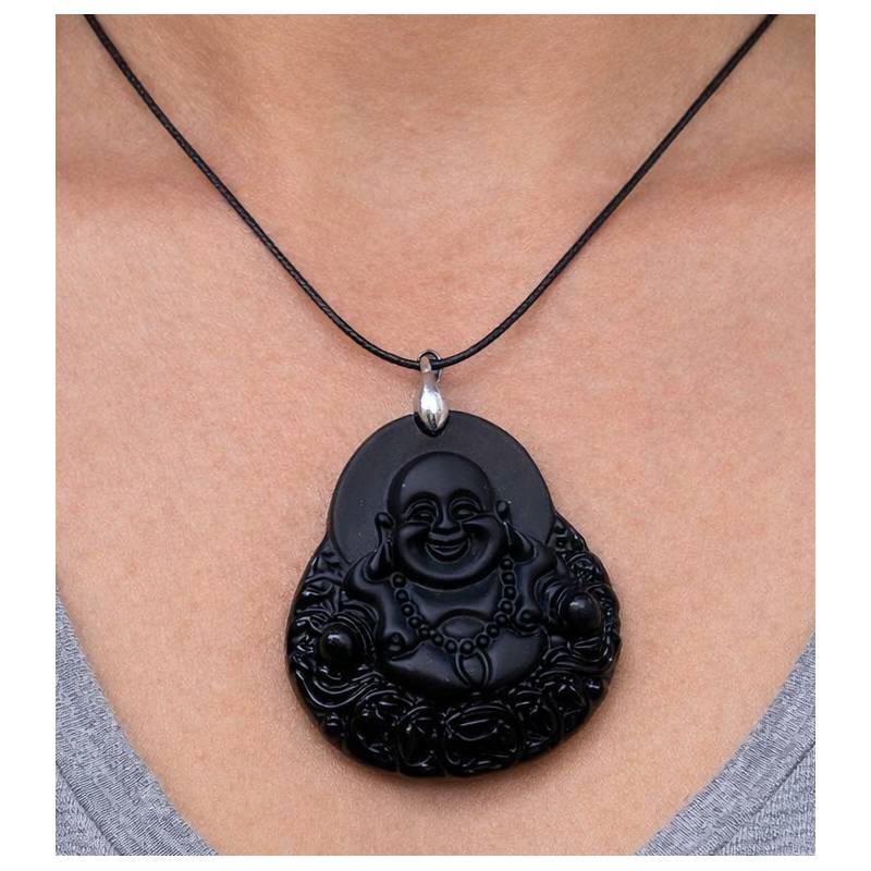 Pendentif Bouddha obsidienne ~5 cm, cordon inclus. Traditionnellement associée à la protection und la purification.