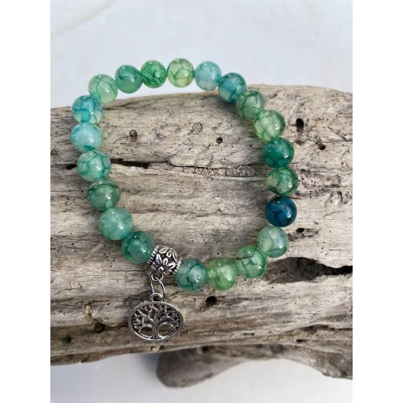 Bracelet agate veine de dragon 8 mm coloris verde con arbre de vie, tour 18-19 cm.