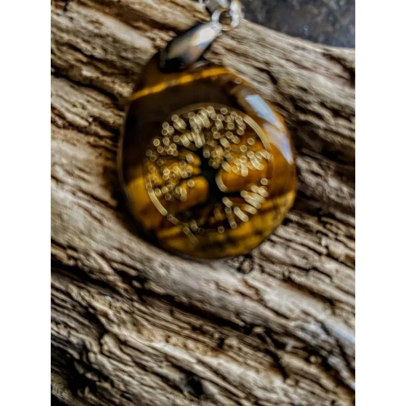 Pendentif œil de tigre motif arbre de vie ~3 cm, cordon inclus. Traditionnellement associé à la protection y l'équilibre.