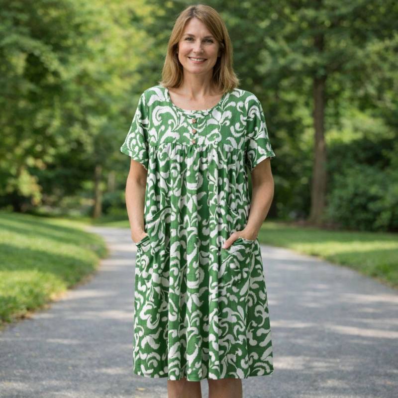 Robe classique 100% polyester, ras de cou, manches courtes, 2 poches. Très ample, sans repassage nécessaire. Mesures : M (H 96 cm / L 56 cm), L (H 98 cm / L 59 cm), XL (H 99 cm / L 60 cm), XXL (H 100 cm / L 61 cm), XXXL (H 102 cm / L 62 cm).