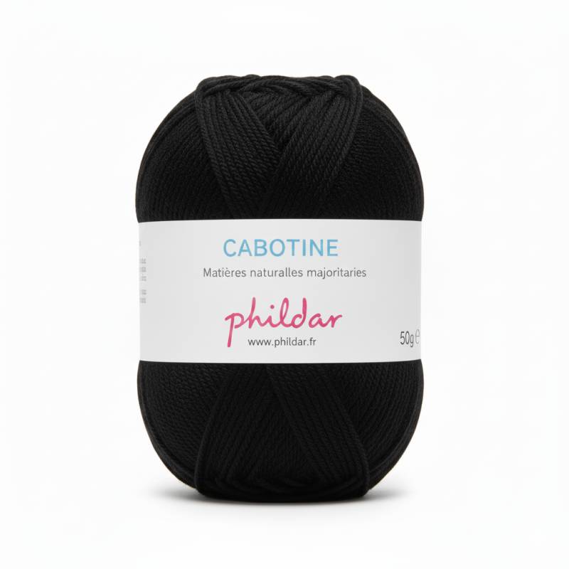 Fil Cabotine Phildar noir 55% coton 45% acrylique 50g/124m. Doux et résistant, aiguilles 3.5mm, Oeko-Tex Standard 100, lavable machine 30°C.