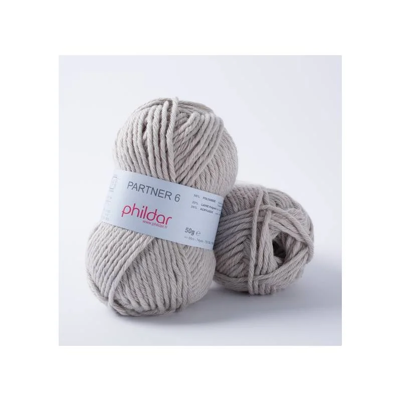 Fil Partner 6 Phildar brume 50% polyamide 25% laine 25% acrylique 50g/68m. Débutants, résistant, aiguilles 5.5-6mm, lavable machine 30°C.